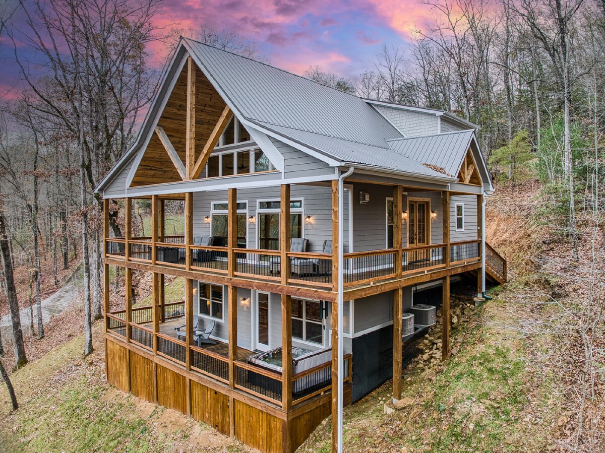 Impresionante cabaña con vistas a la montaña durante todo el año con un entorno privado en el lado de la montaña. 2 dormitorios con un gran plano de piso abierto con una chimenea de leña y una gran área de loft con 2 camas . La cabaña tiene un gran porche con mosquitero con terraza abierta contigua para disfrutar de las impresionantes vistas mientras te relajás en el jacuzzi. También podés disfrutar de senderismo, tubing, pesca, el lago Nottley, el lago Chatuge o pasear por Helen o Blue Ridge. Las opciones y vistas son infinitas. Licencia UCSTR n.º 028724