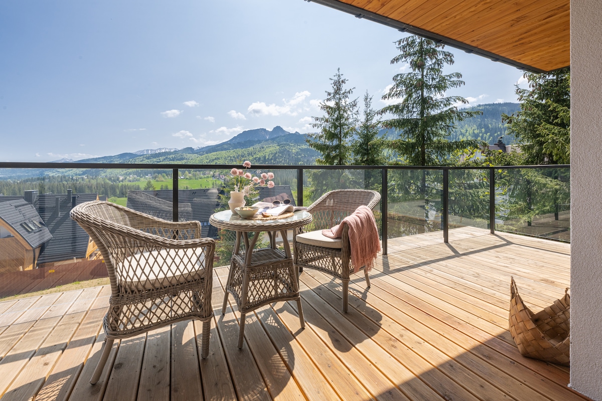 ¡Departamento de un nivel (100 m2) ubicado en una casa de madera a una altitud de 1050 sobre el nivel del mar! La entrada es independiente. El apartamento tiene una gran terraza, ofrecemos tumbonas. Las vistas de las montañas "entra" en la sala de estar:) Puedes estacionar tu auto en la propiedad. La sauna y la chimenea son gratuitas ,el jacuzzi 2x (jacuzzi de madera) pagó extra. Puedes llegar a Gubałówka a pie(1 hora) e ir por teleférico hasta Krupówki (4 minutos). Alrededores: rutas de senderismo y ciclismo, pistas de esquí.
