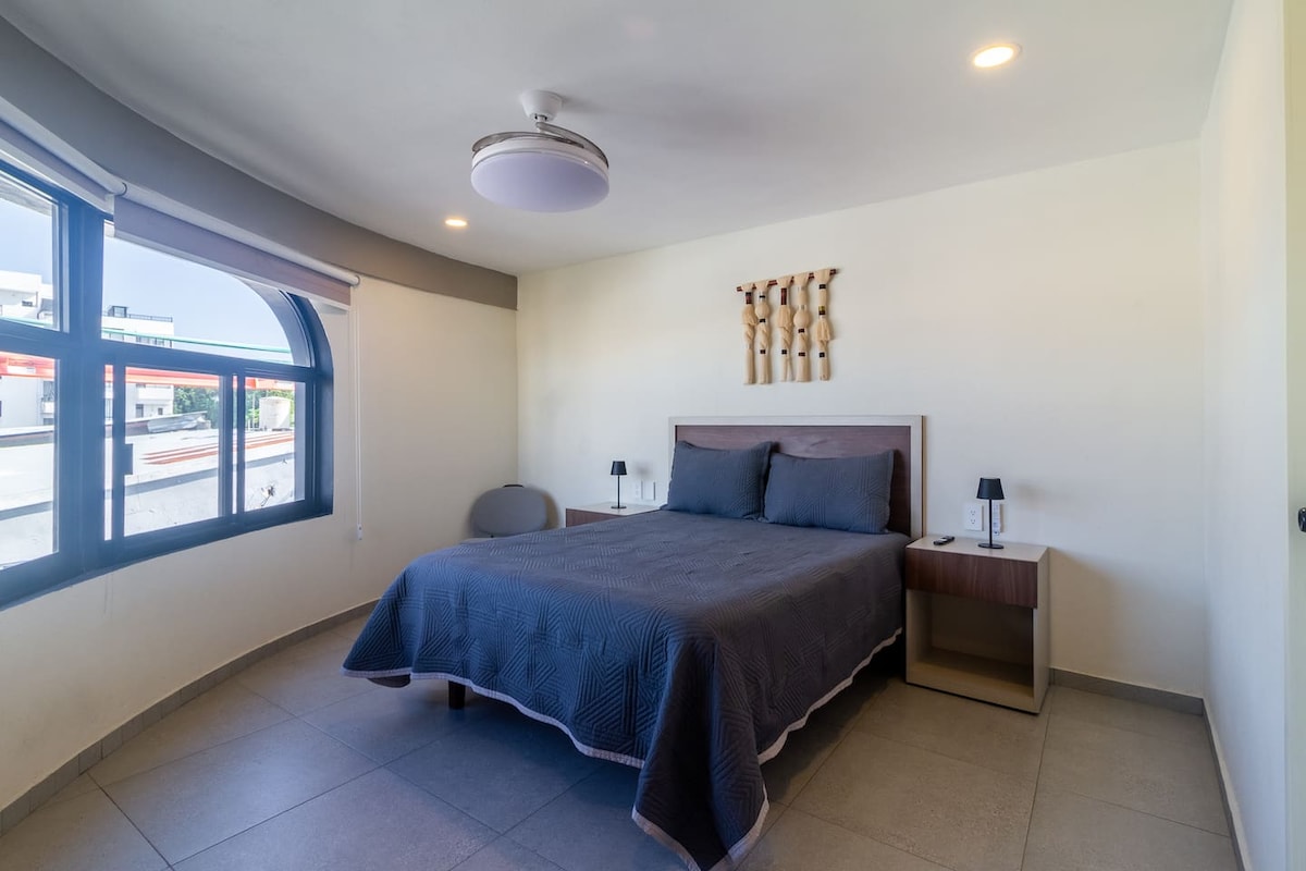 Suite con self-check-in ✔ Cama Queen ✔ Smart TV ✔ Internet rápido y estable para trabajo remoto ✔ Ventilador de techo y secadora de cabello ✔ Frigobar privado ✔ Baño completo con acabados modernos ✔ Cocina compartida por piso equipada con todo lo esencial ✔ Rooftop con comedor al aire libre y vistas a la ciudad Una opción ideal para quienes buscan amplitud, confort y diseño en una de las zonas más dinámicas de Guadalajara: la Colonia Americana, a pocos pasos de Chapultepec.