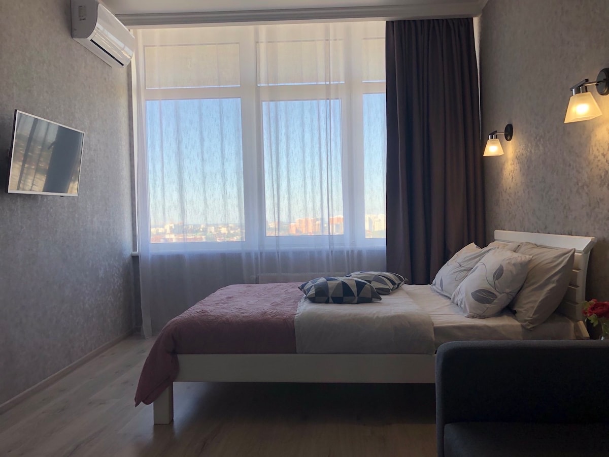Acogedor apartamento de una habitación cerca del centro y el mar. Infraestructura desarrollada. El apartamento está situado en un edificio nuevo. El territorio está vigilado 24/7. El complejo también cuenta con un parque infantil y una farmacia. Tendrá acceso a todo el apartamento y a la infraestructura pública del complejo. Estoy disponible la mayor parte del tiempo. Puede ponerse en contacto conmigo para cualquier pregunta. El coche se puede dejar en el aparcamiento gratuito bajo las ventanas. El área es una intersección de muchas rutas de transporte público.