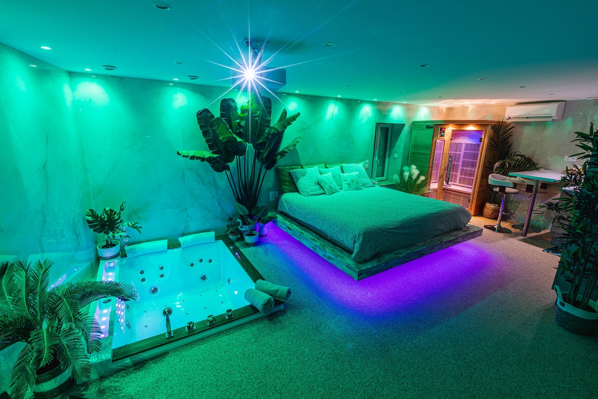 Apartamento de lujo CLIMATIZADO de 50 m² amueblado con SPA / Balneario / Videoproyector Pantalla Motorizada 3 m x 2 m. totalmente privatizado para 2 personas MÁXIMO, en el que encontrará todo lo necesario para olvidarse de la rutina y evadirse. Posibilidad de añadir una cama de una o dos plazas adicionales bajo petición, con 72 horas de antelación (con suplemento)