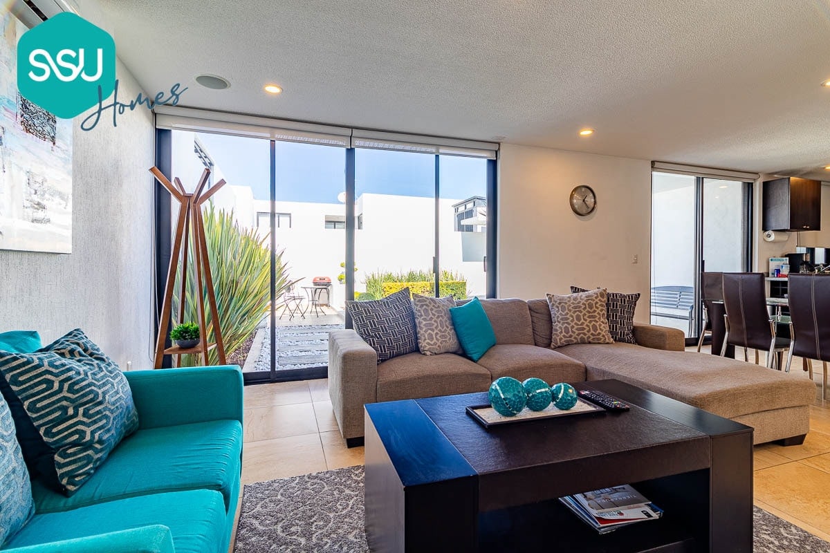 💵 Facturación Disponible 💵 🌿Refugio con estilo en Querétaro🌿 🛏️ 2 Recámaras | 2 Baños. ⭐Recámara principal Cama King baño privado. ✨Segunda recámara: Cama Queen 👶 Cuna disponible bajo solicitud Espacios Comunes 🎥 Sala de TV: Pantalla de 65" con acceso a streaming. 🍳 Cocina: Totalmente equipada para tu comodidad 🌿 Patio trasero: Tranquilo y acogedor, ideal para relajarse Amenidades 🏊 Alberca 💪 Gimnasio 🏀 Cancha de baloncesto 🎡 Área de juegos para niños ✨ Cosmos Homes Quality.