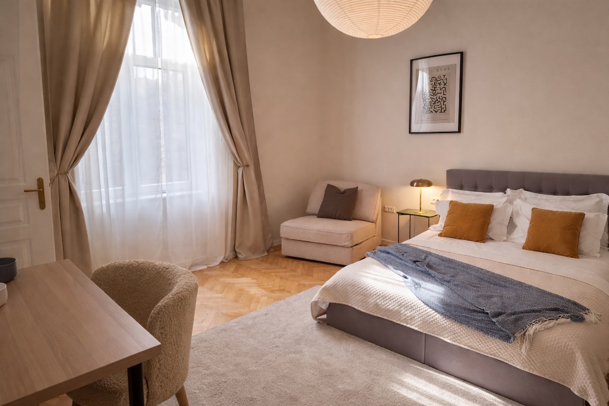 Escape to our calm, renovated one-bedroom apartment in the heart of Zagreb. This bright, airy retreat on the first floor comfortably fits 2-3 guests. Features high ceilings, a dedicated workspace, and modern amenities. Perfectly located just an 8-10 minute walk from the Main Square, Zrinjevac Park, and top attractions. Enjoy the perfect blend of city access and peaceful comfort.