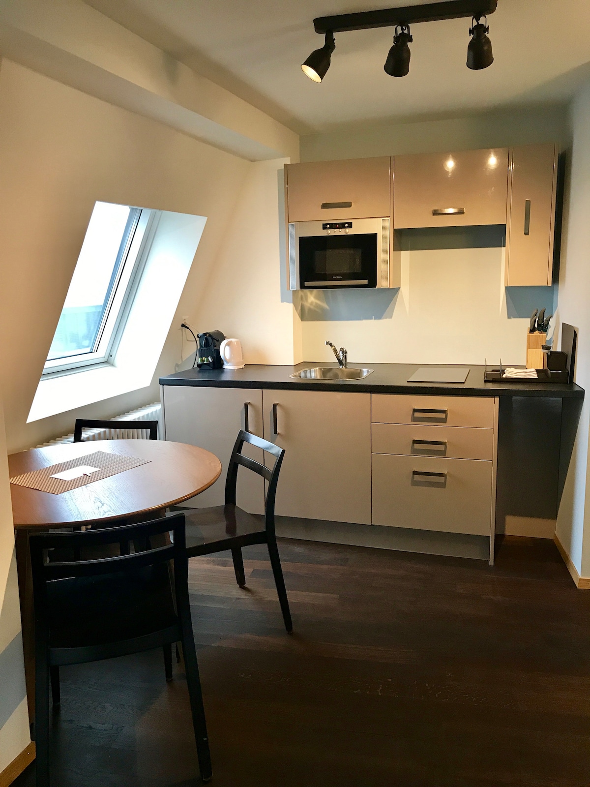 *ideal location for business as well as leisure travellers looking for a temporary place in Zurich*. Modern & central penthouse studio in a quiet street. - Fully furnished - Coffee station/coffee machine - Small beautiful balcony - King-size box-spring bed (160x200) - HD-Beamer for a cinema experience - Working desk station - Modern bathroom with window, washing machine & dryer - Cozy table dining area - Big wardrobe space - Build in blinds Private parking upon request (15CHF/night)